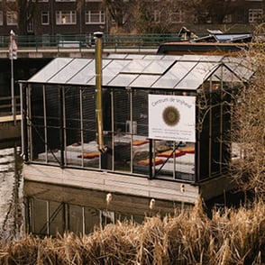 Centrum de Vrijheid is gevestigd in een dromerige kas op het water, bij een bijzondere woonboot.